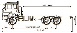 Шасси 6*4, длина рамы 5 970 мм, межосевое растояние мм, грузоподъемность 12 тонн